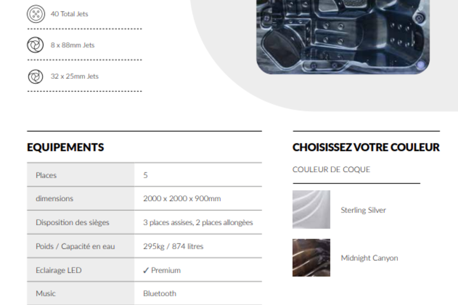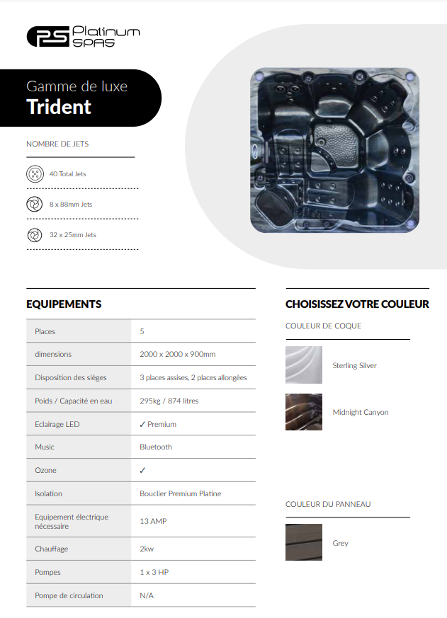 5 800,00 €Le Trident est un spa de départ idéal conçu pour cinq personnes avec deux chaises longues et trois sièges. Il comprend 40 jets et lumières LED. En utilisant des pompes 1 x 2HP, la pression du jet est relativement puissante avec une bonne hydrothérapie.
