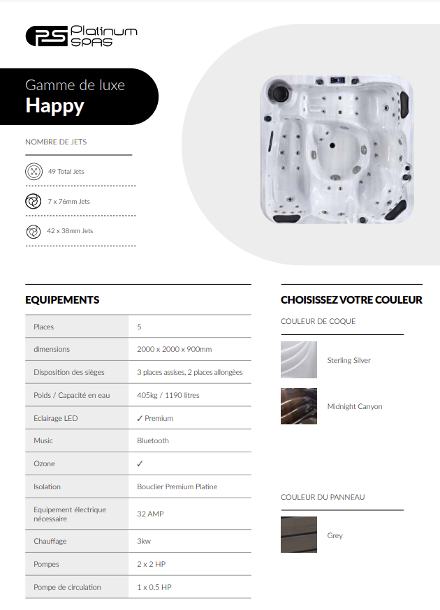 7 780,00 €Le Happy est un bain à remous de taille familiale conçu pour cinq personnes avec deux chaises longues et trois sièges. Il comprend 49 jets et lumières LED. En utilisant 2 pompes de 2 CV, la pression du jet est puissante et donc l'hydrothérapie est exceptionnelle.
