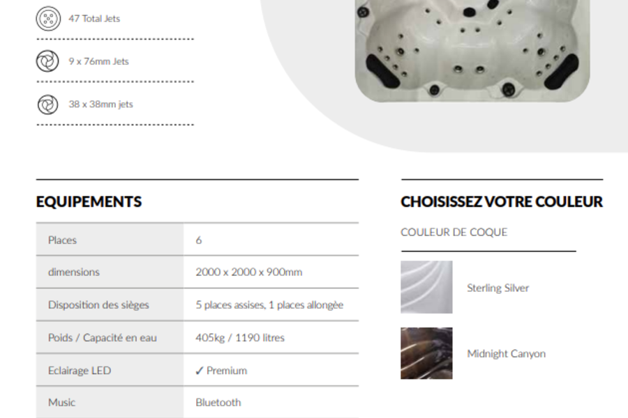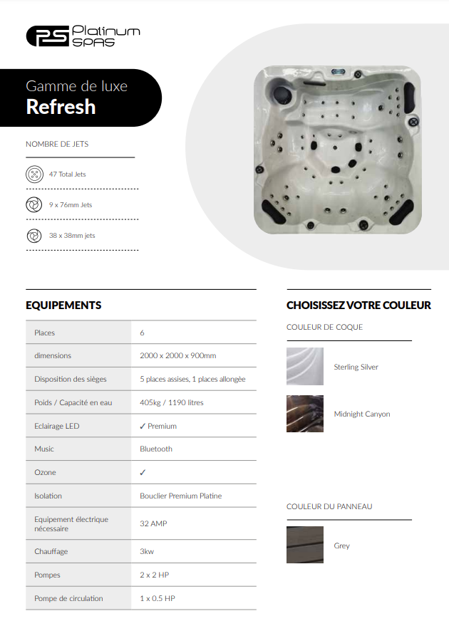 7 780,00 €Le Refresh est un spa de taille familiale conçu pour six personnes avec un transat et cinq sièges. Il comprend 47 jets et lumières LED. En utilisant 2 pompes de 2 CV, la pression du jet est puissante et donc l'hydrothérapie est exceptionnelle.
