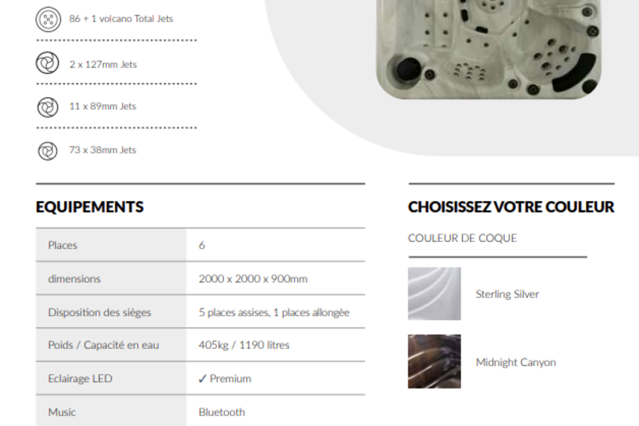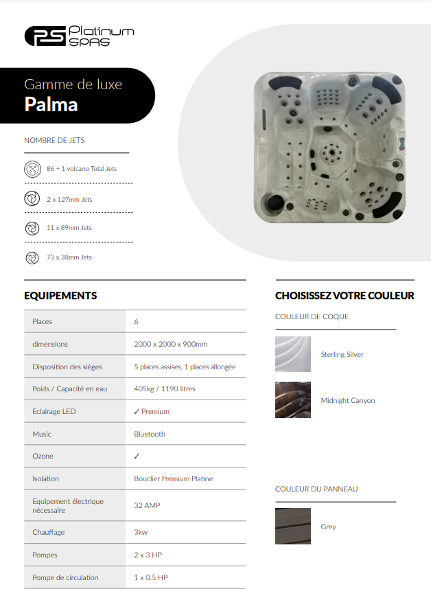 8 473,00 €Le Palma est un bain à remous familial conçu pour six personnes avec une chaise longue et cinq sièges. Il comprend 87 jets et lumières LED. En utilisant 2 pompes de 3 CV, la pression du jet est puissante et donc l'hydrothérapie est exceptionnelle.