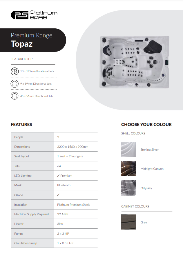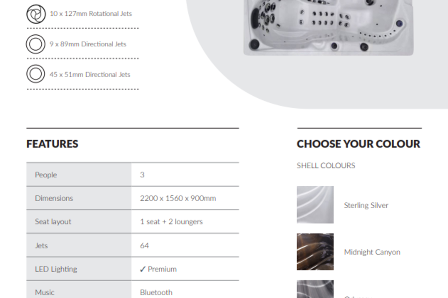 8 473,00 €Le Topaz est un spa compact conçu pour jusqu'à trois personnes avec deux chaises longues et un siège. Il comprend des jets puissants, des jeux d'eau et des lumières LED. En utilisant 2 pompes de 3 CV, la pression du jet est puissante malgré la taille et donc l'hydrothérapie est exceptionnelle.