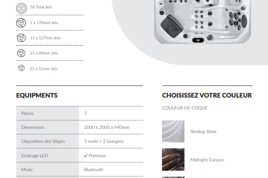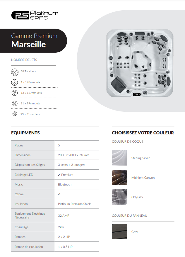 9 108,00 €Le Marseille est conçu pour accueillir jusqu'à cinq personnes avec deux transats et trois sièges. Il comprend 58 jets, des jeux d'eau et des lumières LED. En utilisant 2 pompes de 2 CV, la pression du jet est incroyablement puissante et l'hydrothérapie est donc exceptionnelle.