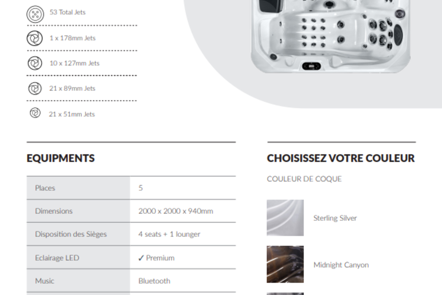9 108,00 €Le Monaco est conçu pour accueillir jusqu'à cinq personnes avec une chaise longue et quatre sièges. Il comprend 53 jets, des jeux d'eau et des lumières LED. En utilisant 2 pompes de 2 CV, la pression du jet est incroyablement puissante et l'hydrothérapie est donc exceptionnelle.